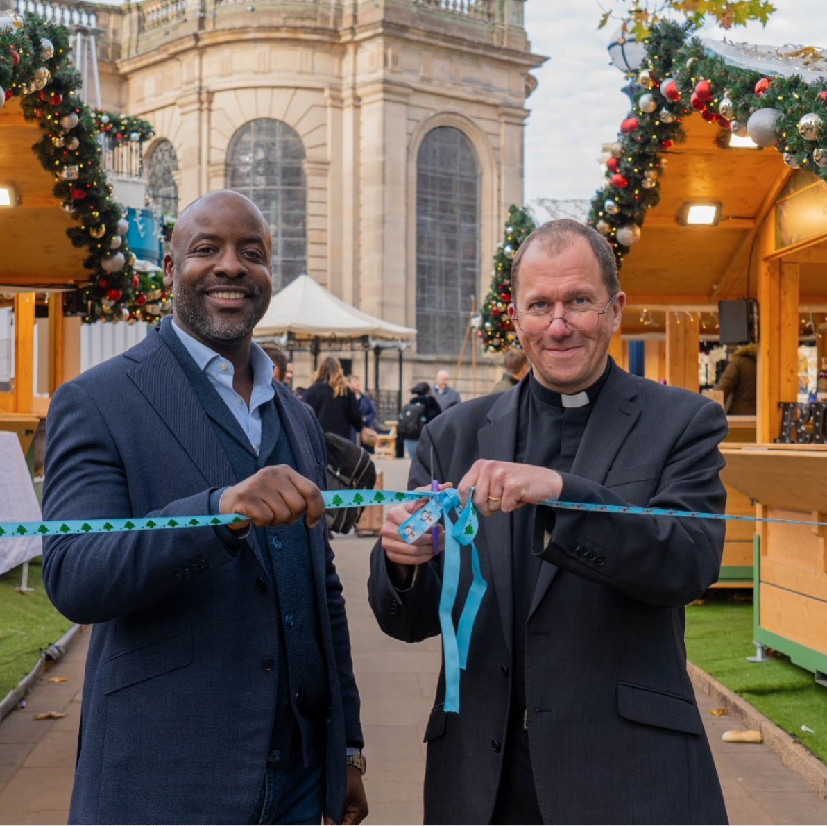 Christmas in Cathedral Square with Alex Tross, Deputy Chair of Colmore BID (left) and Matt Thomson, Dean of Birmingham, (right)