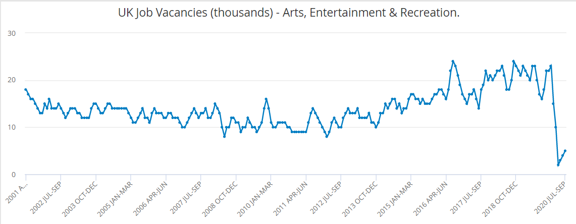 Jobs in the UK’s entertainment industry have fallen sharply over the course of 2020, data from the Office of National Statistics has revealed.