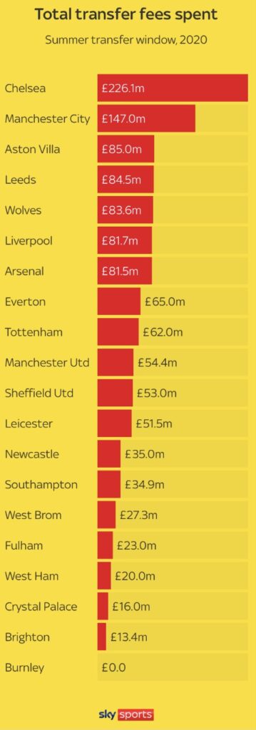 Six clubs did not receive any money from outgoings, including Aston Villa, Burnley, Fulham, Leeds, Newcastle and Sheffield United.