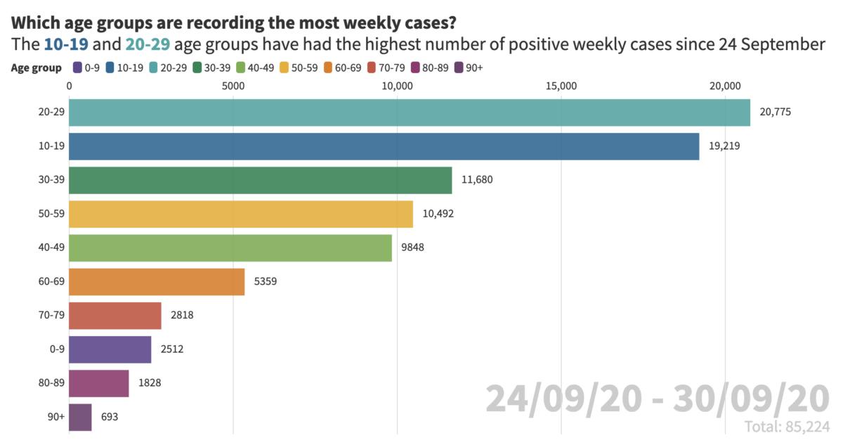 Watch our bar chart race which shows when those aged between 10-19 and 20-29 became the positive case leaders.